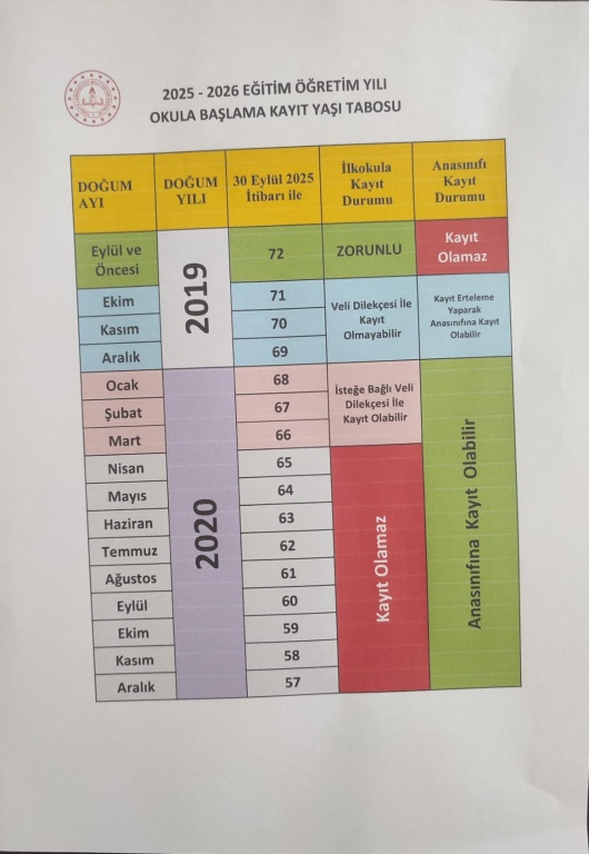 2025 - 2026 Eğitim Öğretim Yılı Anasınıfı Ve İlkokul 1. Sınıf Kayıtları Başladı. Anasınıfına ve 1. Sınıfa Başlayacak Öğrenci Velilerinin Kimlik Belgeleri İle Okulumuza Müracat Etmeleri Gerekmektedir. Kayıtlar Yayınlanan Kayıt Yaşı Tablosuna Uygun Olarak yapılacaktır.
